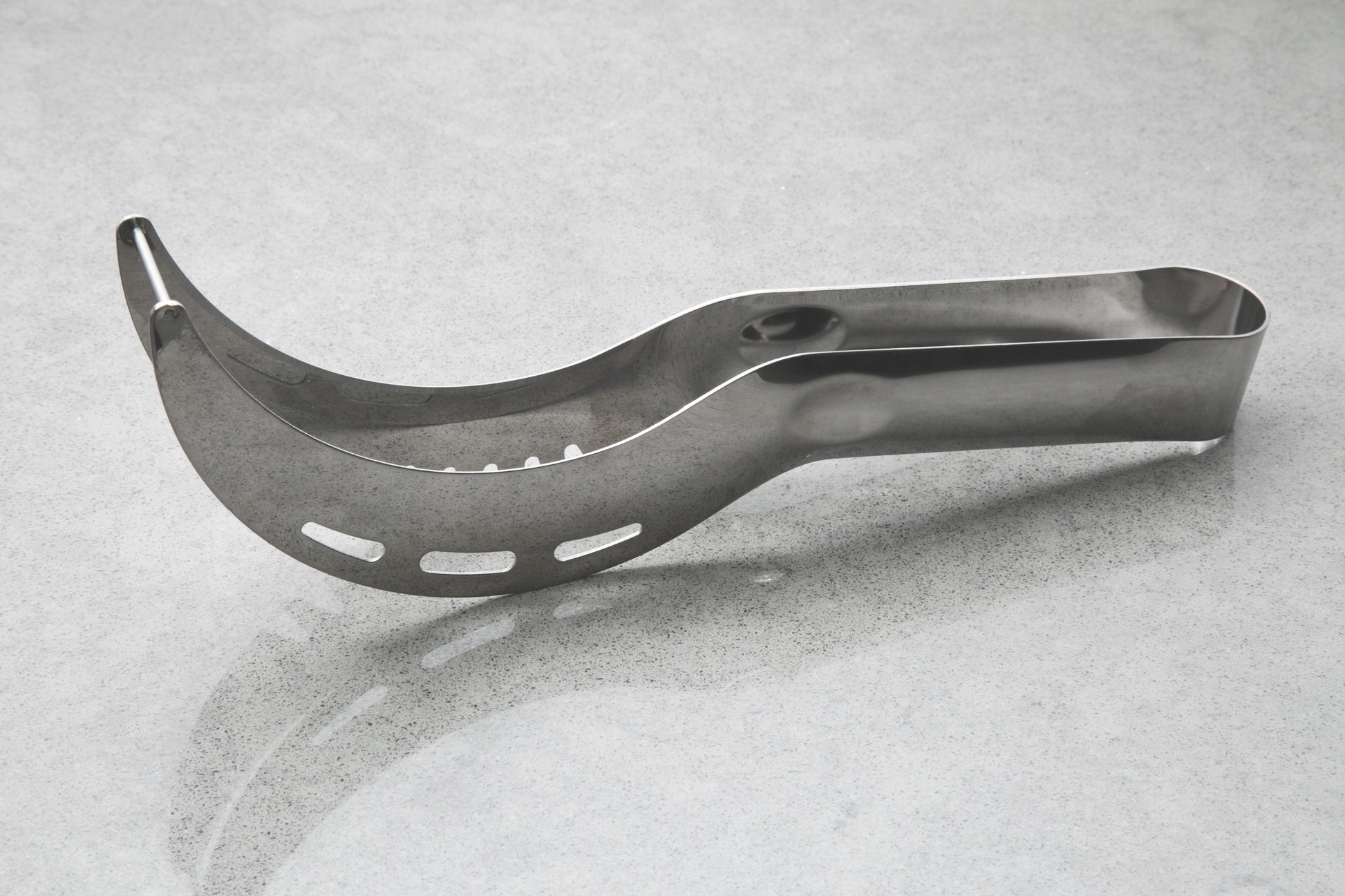 Side view of a chrome melon scooper. A handy tool for creating summer treats from your favorite fruit.